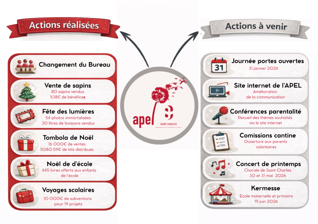 Chers parents, À l’approche de la fin d’année, l’APEL Saint-Charles souhaite s’adresser à l’ensemble des familles de l’école, du collège et du lycée afin de rappeler son rôle au sein de l’Institution. Tout au long de l’année, l’APEL s’engage aux côtés de l’établissement pour soutenir les projets pédagogiques et éducatifs, accompagner les élèves, favoriser les temps de convivialité et contribuer à la vie de l’institution, grâce à l’implication de parents bénévoles et au soutien des familles. De nombreuses actions ont déjà été menées depuis la rentrée scolaire et d’autres projets sont en préparation pour les mois à venir, avec un objectif commun : agir au service des élèves et renforcer le lien entre les familles et l’établissement.