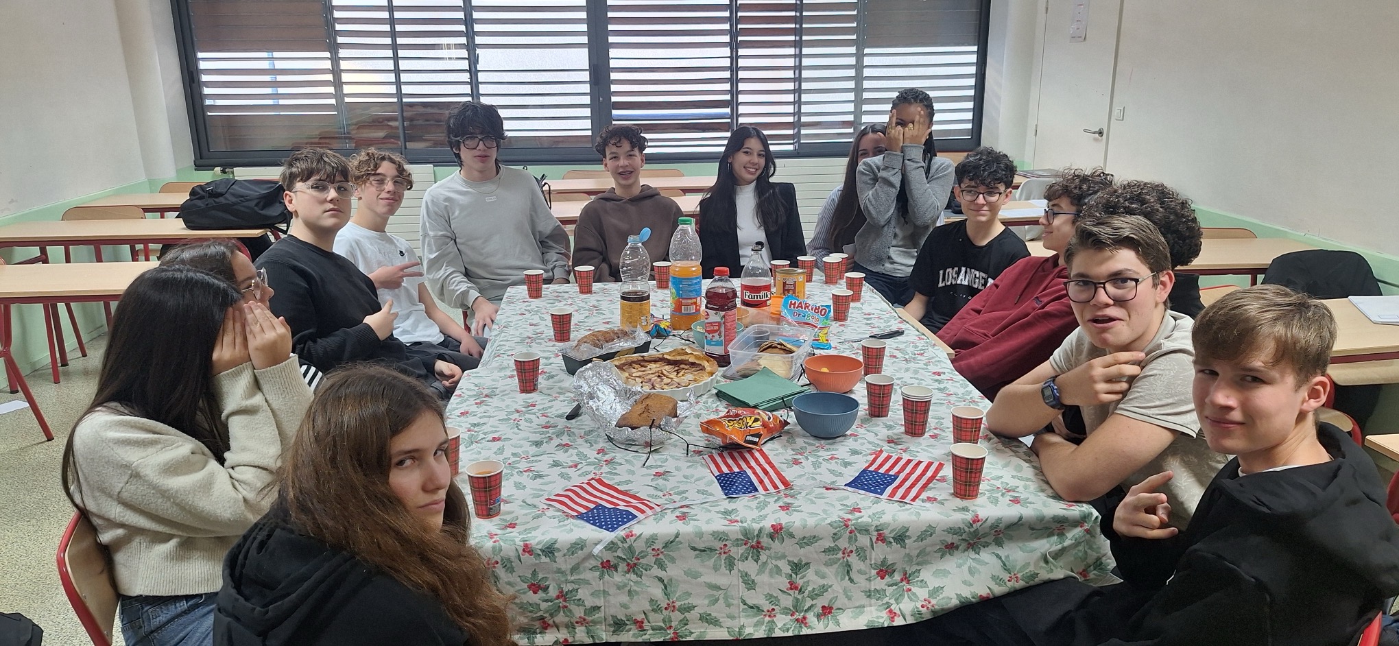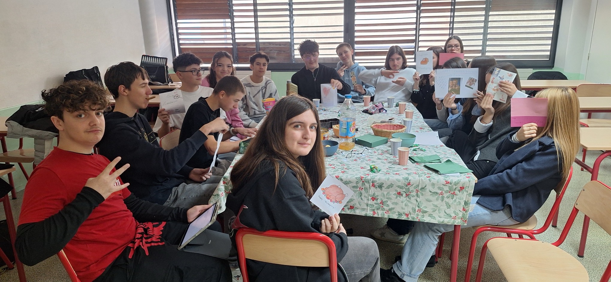 Les élèves ont d’abord partagé un goûter composé de spécialités plus ou moins américaines, permettant à chacun de découvrir ou redécouvrir quelques saveurs emblématiques. Au-delà de ce moment gourmand, la dimension culturelle et humaine de Thanksgiving a été mise à l’honneur : chaque élève a échangé avec un camarade un petit cadeau ou une carte rédigée en anglais.